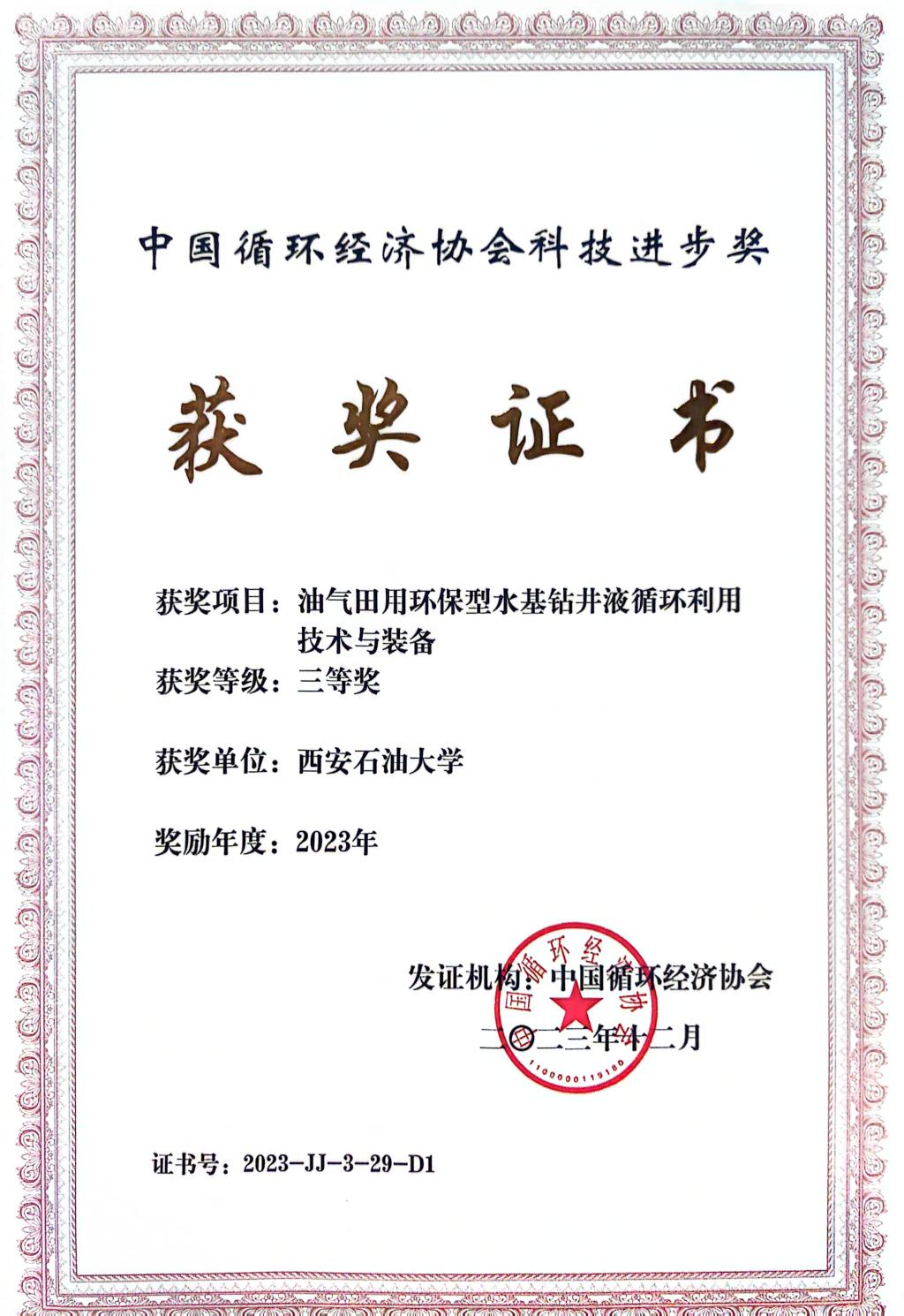 近日,我院陈刚教授团队与中国石油川庆钻探工程有限公司长庆钻井总公司、陕西合信油服科技股份有限公司、陕西兰宇工程科技有限公司和西安阿伯塔资环分析测试技术有限公司合作的科研成果获得2023年陕西省环境保护科学技术奖一等奖和2023年中国循环经济协会科学技术奖——科技进步奖(技术开发类)三等奖。