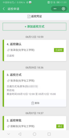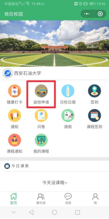 3、即将返校的学生。返校前须登录“我在校园”提交返校申请,由辅导员审批同意之后,方可添加填写具体的返校方式,包括具体的到校时间、返校所乘的交通工具、车次等,到校之后登录“我在校园”进入“返校申请”模块儿并点击返校确认。到校后打卡方式与上述已返校同学的打卡方式相同,具体方法详见第2。