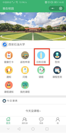 2、已返校学生。每日需在“我在校园”“日检日报”模块中进行2次健康情况登记,具体分别为早6-10点进行“晨检”、上午11-下午15点“午检”,即可完成当日打卡。