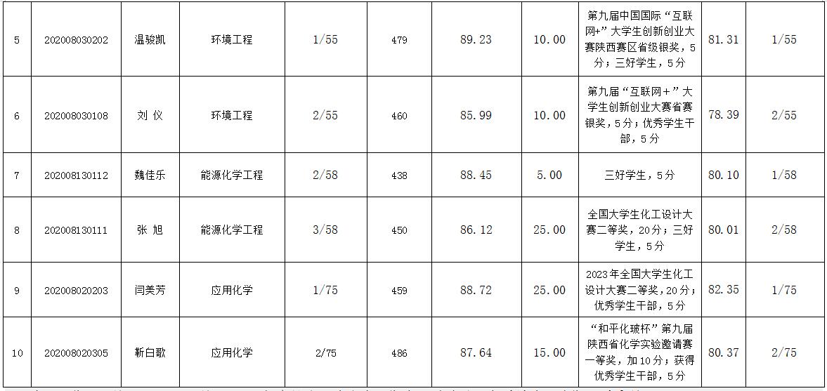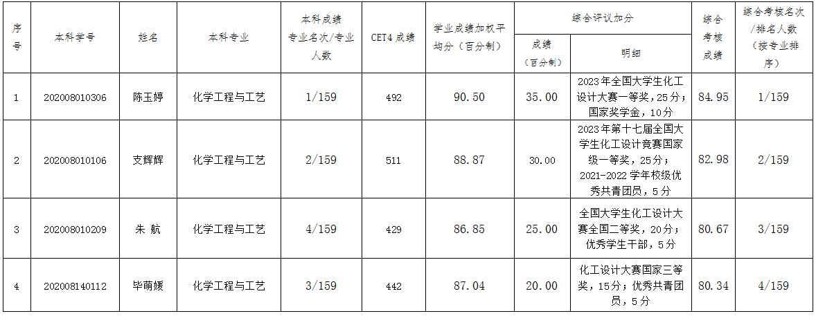 根据《西安石油大学推荐、接收优秀应届本科毕业生免试攻读硕士学位研究生管理办法(修订)》(西石大研〔2021〕227号)文件精神、《西安石油大学关于做好2024年推荐优秀应届本科毕业生免试攻读硕士学位研究生工作的通知》和《化学化工学院推荐2024届优秀应届本科毕业生免试攻读硕士学位研究生实施细则》文件要求,经学生自愿申请,学院及学校相关部门资格审核,学院推免生遴选工作领导小组审定,现将我院2024届本科毕业生推荐免试攻读硕士学位研究生名单公示如下: