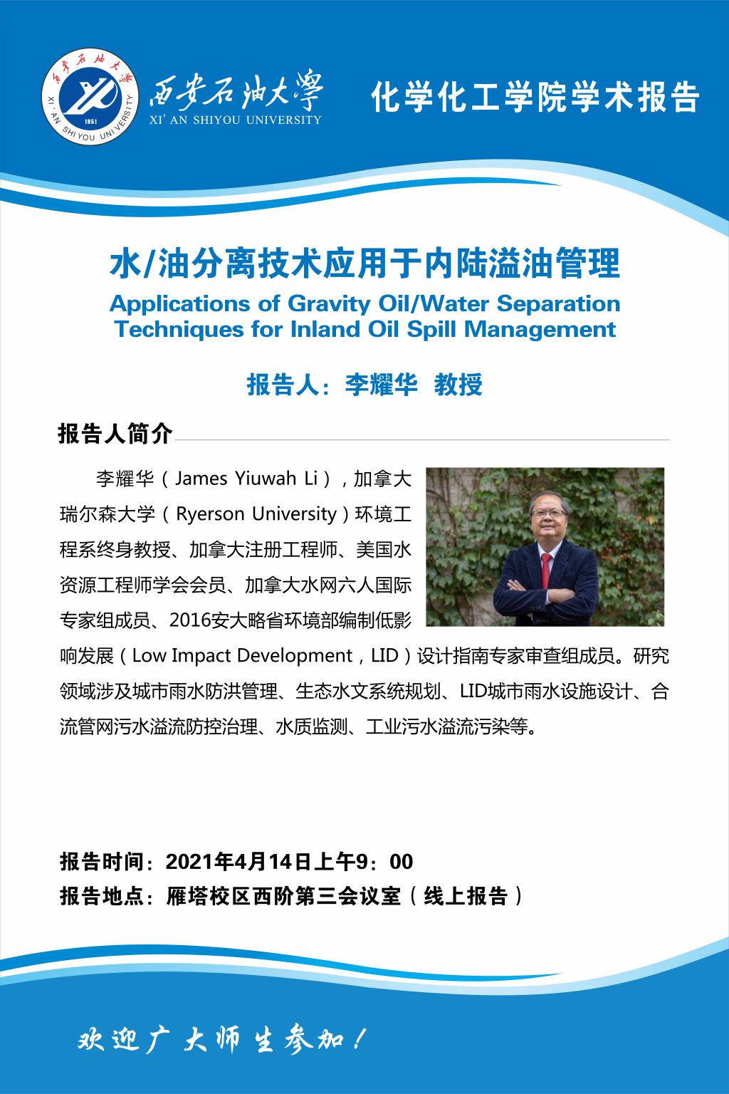【学术报告】水/油分离技术应用于内陆溢油管理——报告人:李耀华 教授