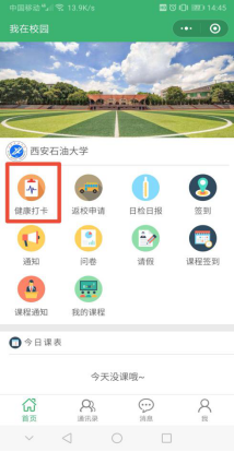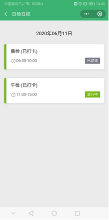 2、已返校学生。每日需在“我在校园”“日检日报”模块中进行2次健康情况登记,具体分别为早6-10点进行“晨检”、上午11-下午15点“午检”,即可完成当日打卡。