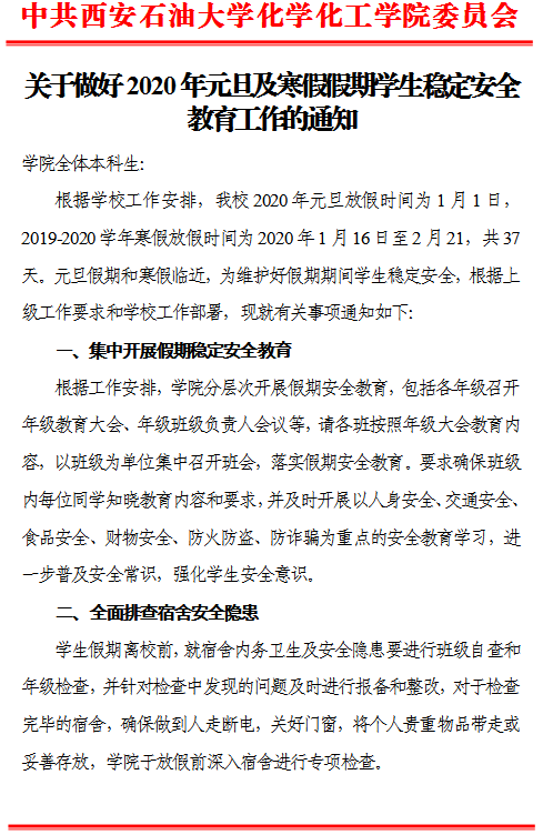 【安全教育】关于做好2020年元旦及寒假假期学生稳定安全教育工作的通知