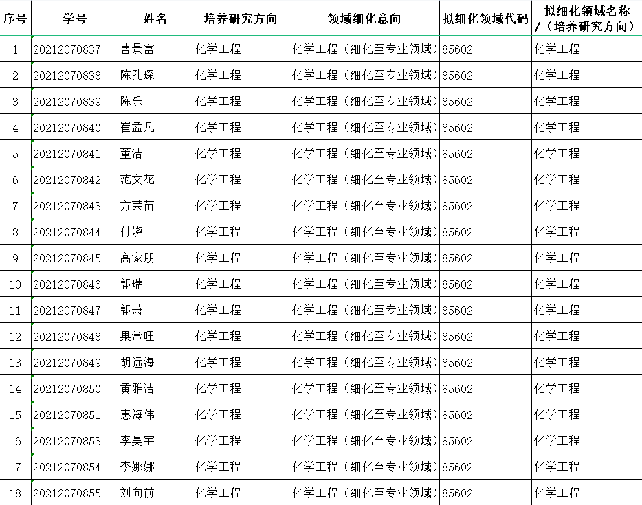根据《关于电子信息等8种专业学位类别专业领域指导性目录的说明》(工程教指委〔2021〕1号)、陕西省教育厅“关于专业学位研究生专业领域细化工作的指导意见”及学校学位评定委员会会议精神,按照研究生院下发的《西安石油大学工程类专业学位类别硕士研究生专业领域细化工作方案》。经2020级专业硕士研究生申请、学院审核、学院教授委员会表决通过,现将我院2020级专业学位硕士研究生专业领域细化选择结果公示如下。
